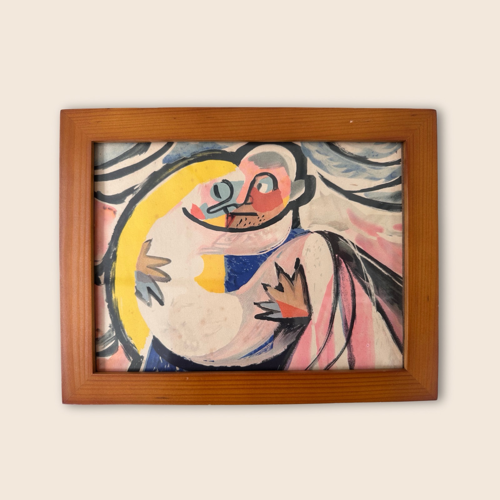 Deze bijzondere vintage kunstprint straalt warmte en expressie uit. De kleurrijke, abstracte compositie toont twee figuren in een omhelzing, weergegeven in speelse vormen en dynamische penseelstreken. De print zit in een eenvoudige houten lijst die het werk een tijdloze uitstraling geeft.
