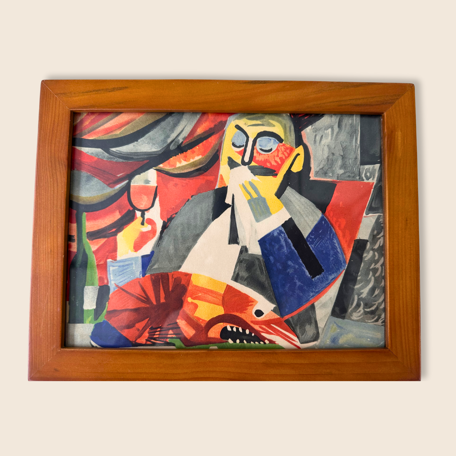 Deze gevonden print is ingelijst in een authentieke vintage houten lijst die het werk een warme, klassieke uitstraling geeft. Perfect voor liefhebbers van moderne kunst, retro-inrichting of iedereen die een uniek statement piece zoekt voor thuis of op kantoor.