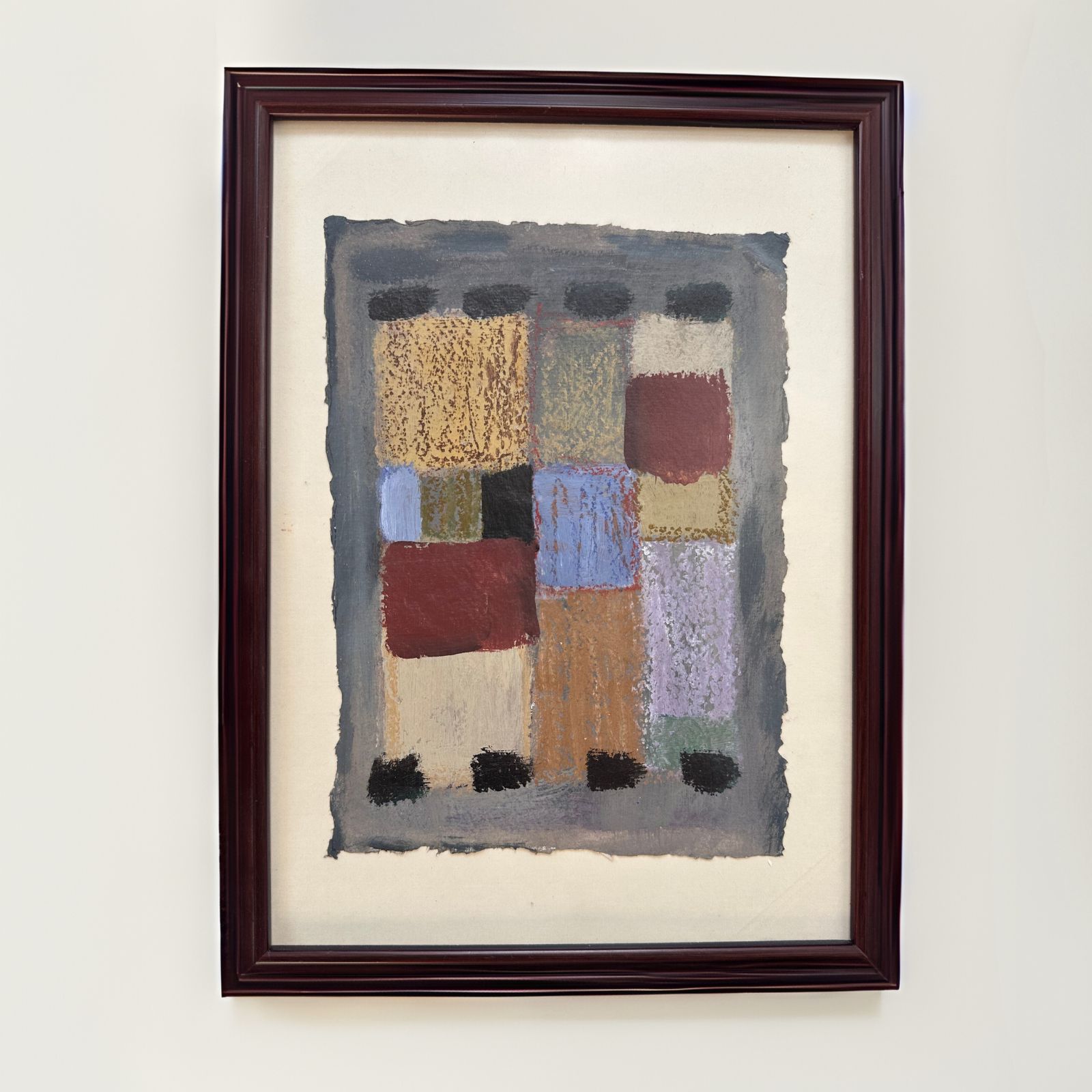 Breng rust en karakter in je interieur met Stilte in Structuur — een intrigerend abstract werk waarin blokken in warme, aardse tonen samenkomen in een compositie die zowel speels als gebalanceerd is. De subtiele texturen en ruwe randen van het papier geven het werk een ambachtelijk karakter, terwijl de diepe kleuren in contrast staan met de zachte, neutrale achtergrond. Het geheel is omlijst in een klassieke houten lijst met een diepe bordeaux finish, die het stuk elegant en tijdloos maakt.